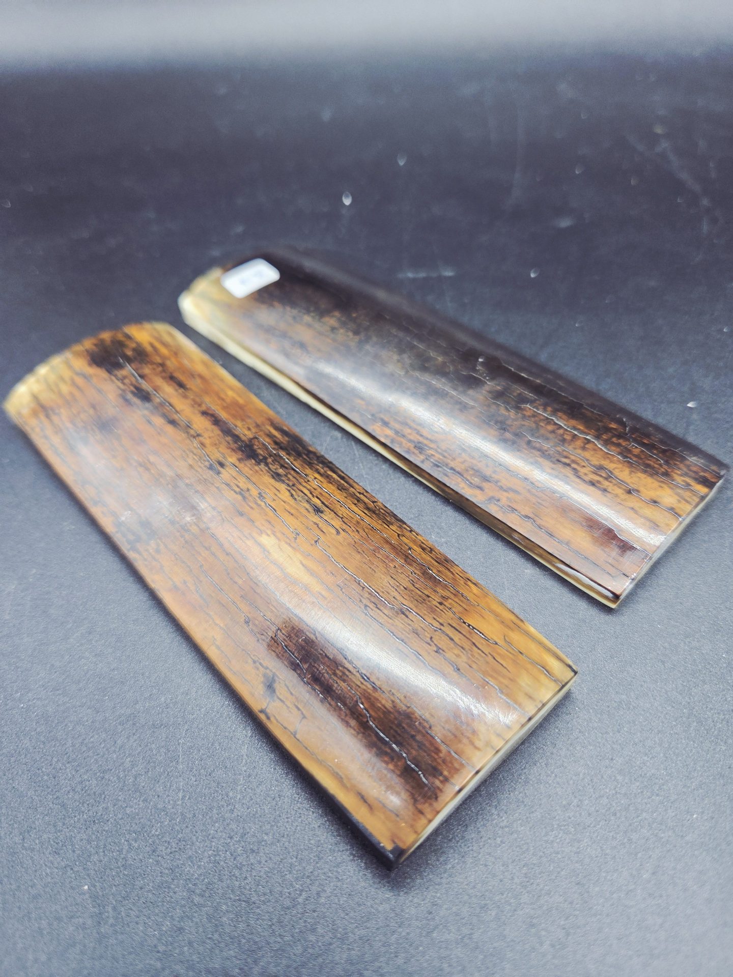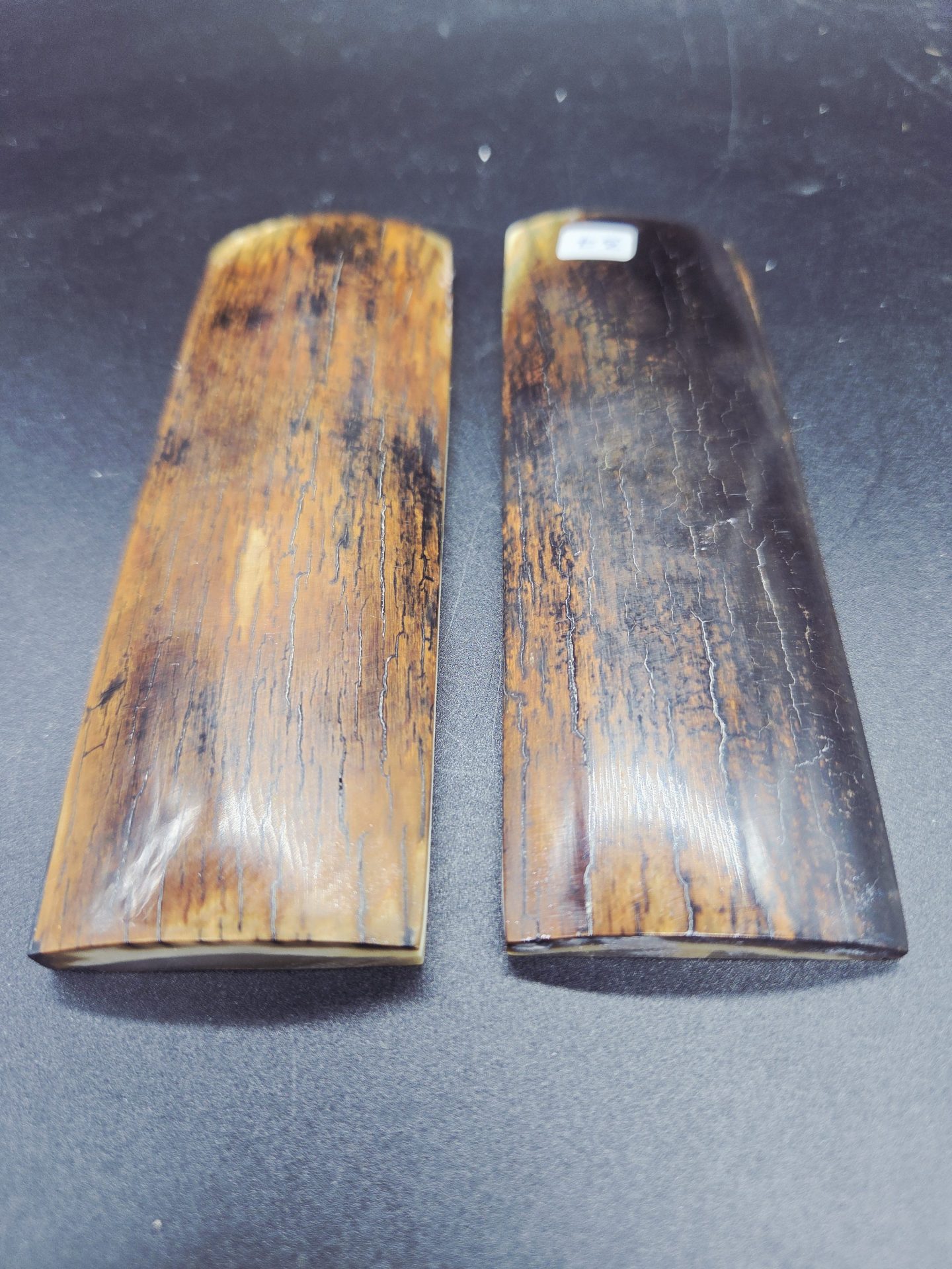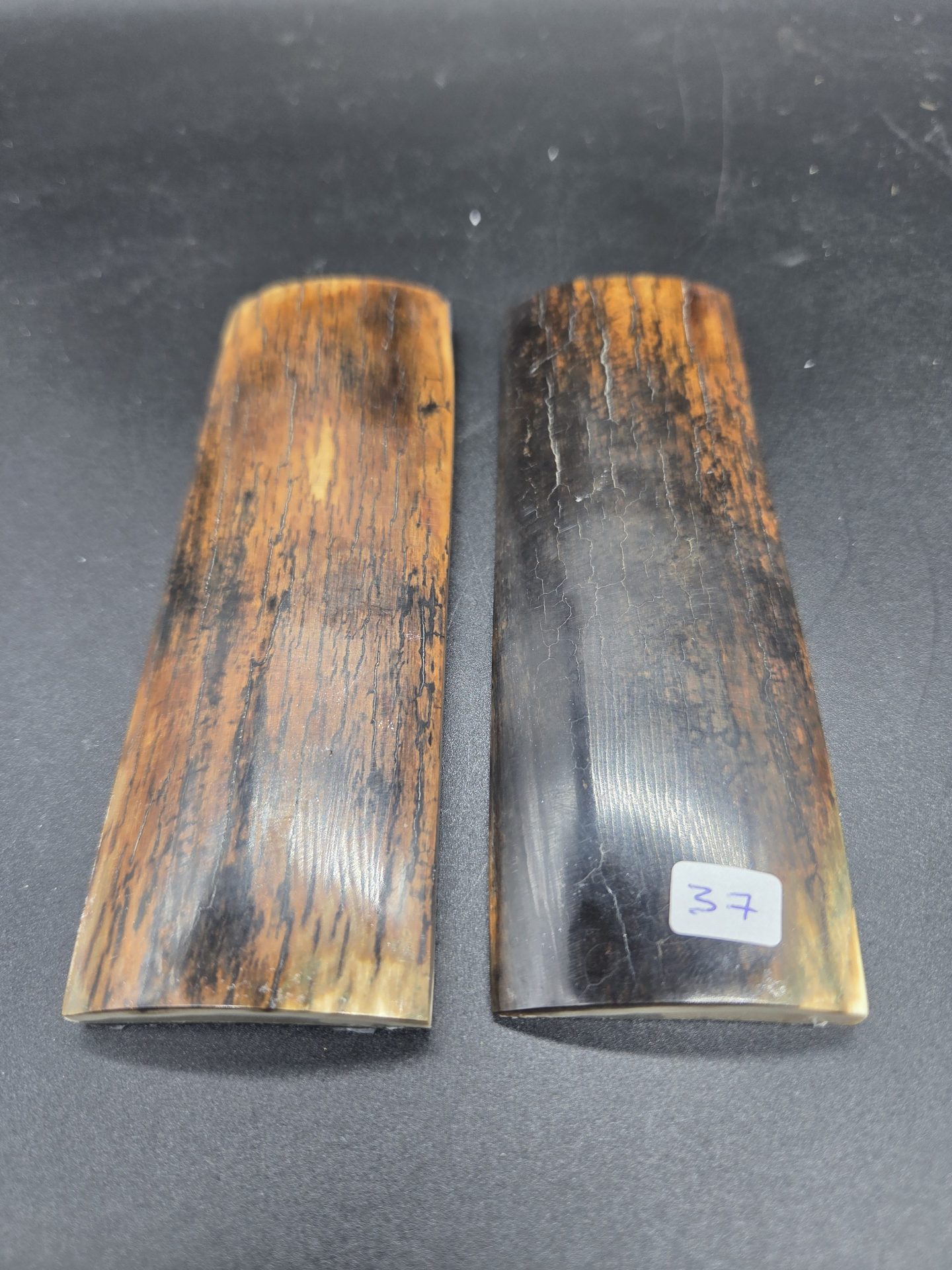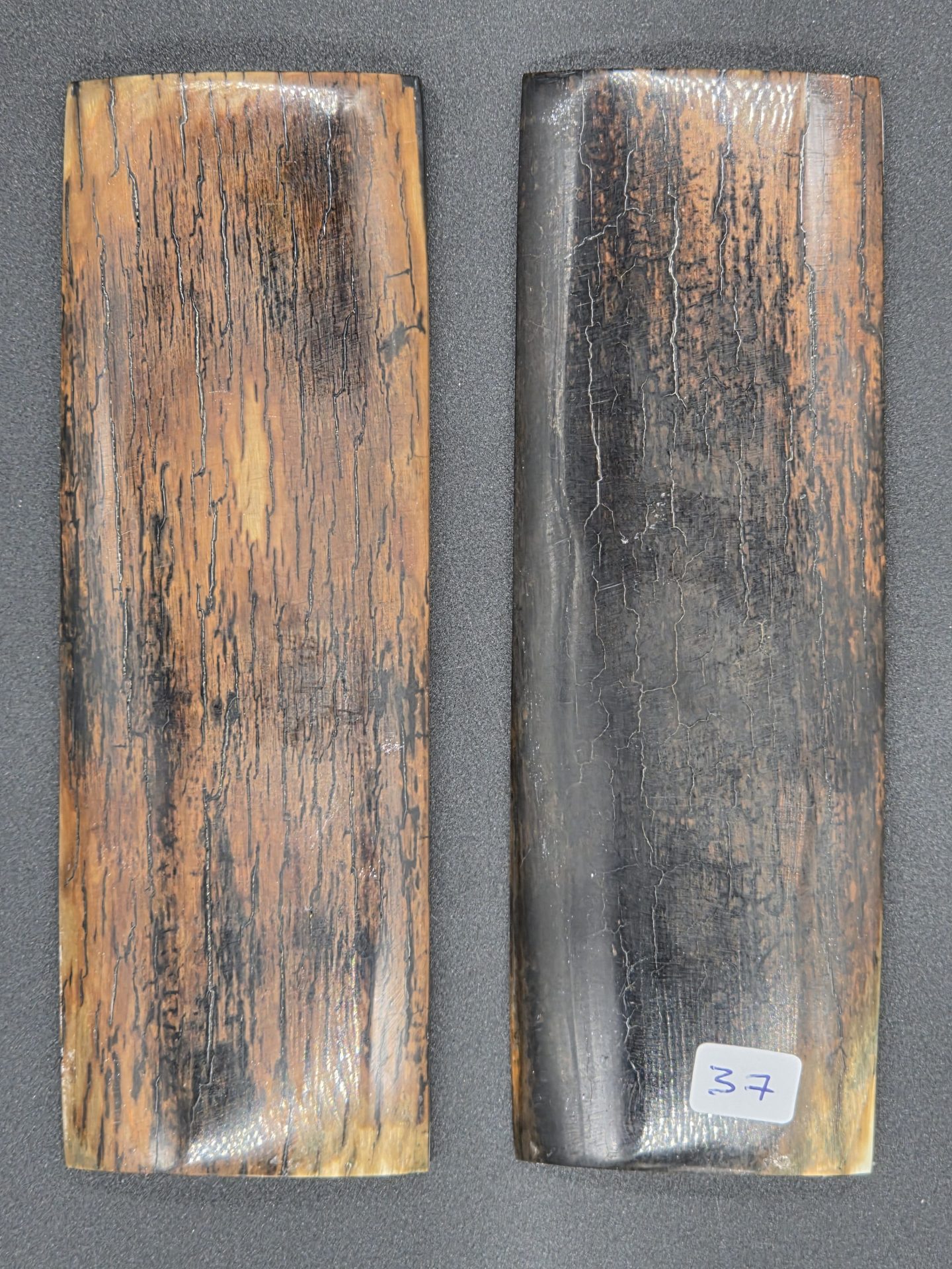 Paire d’écailles de mammouth stabilisées présentant un remarquable aspect bois avec grain prononcé. Parfaites pour les créations organiques et texturées. Matériau d’exception offrant une structure ligneuse saisissante, idéal pour les pièces nécessitant caractère et authenticité naturelle.