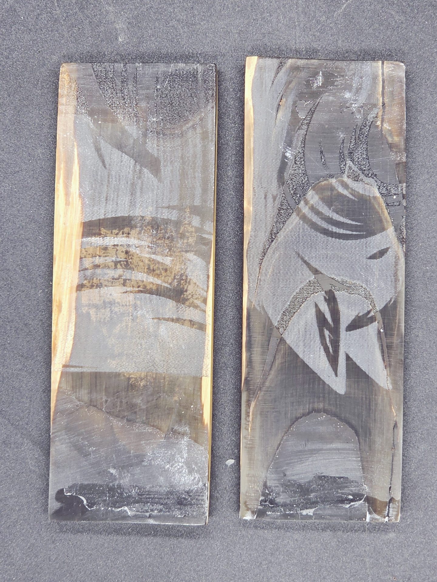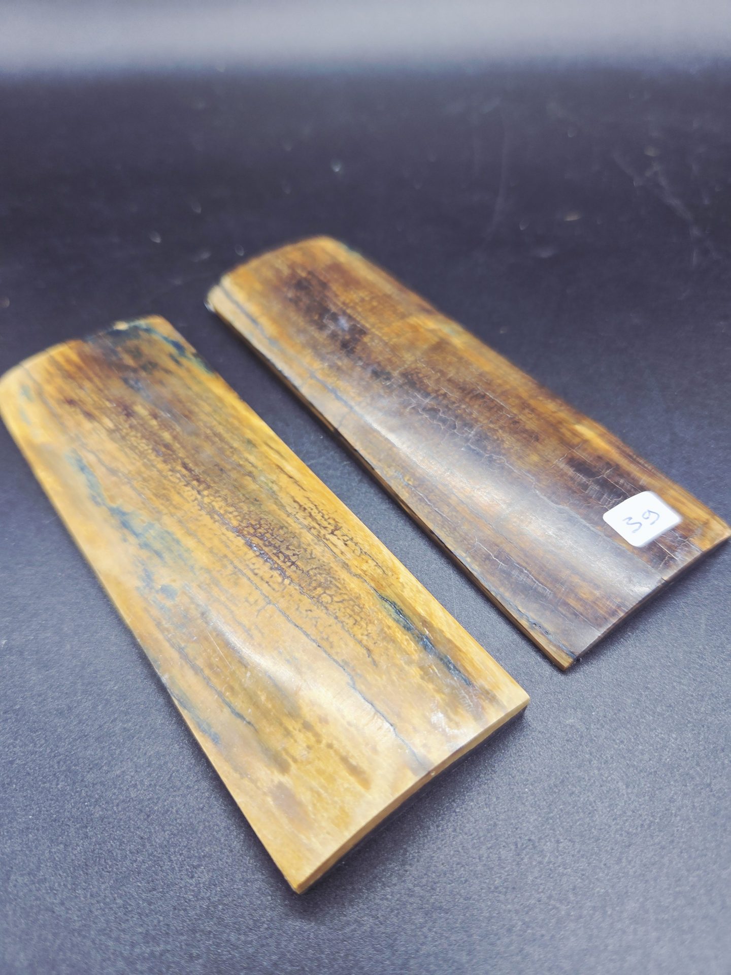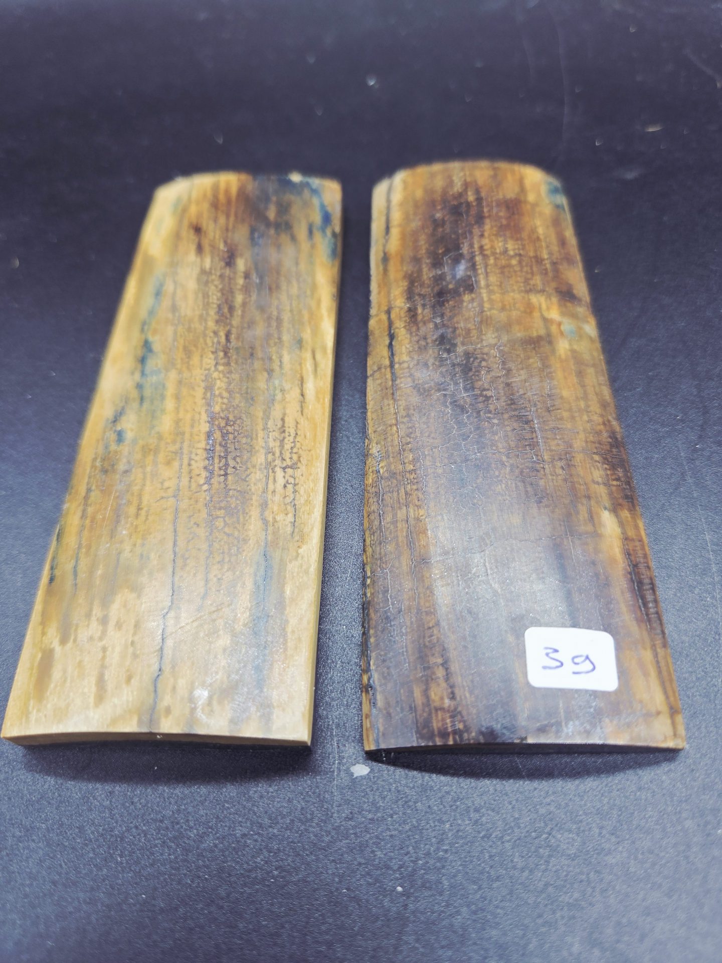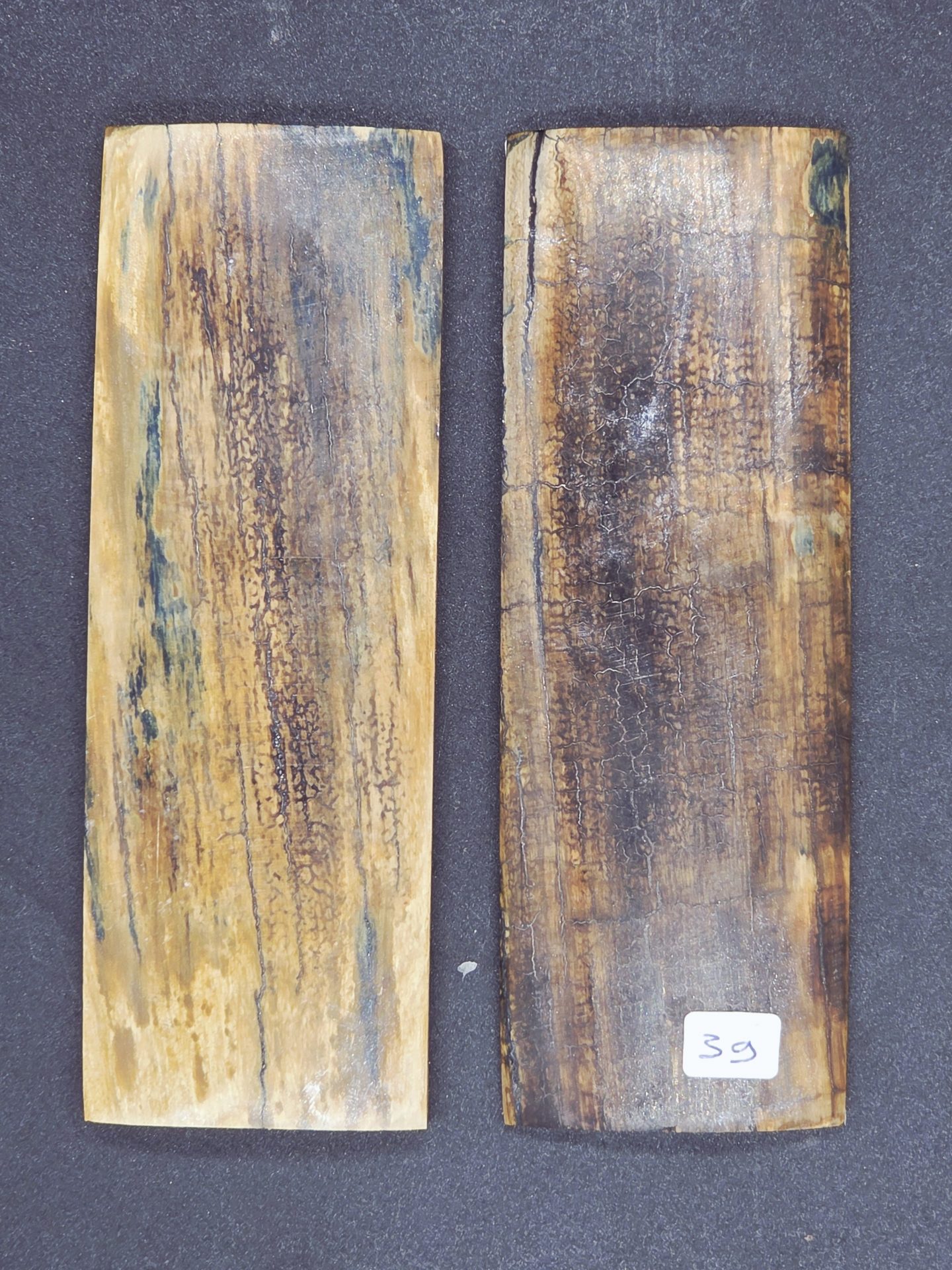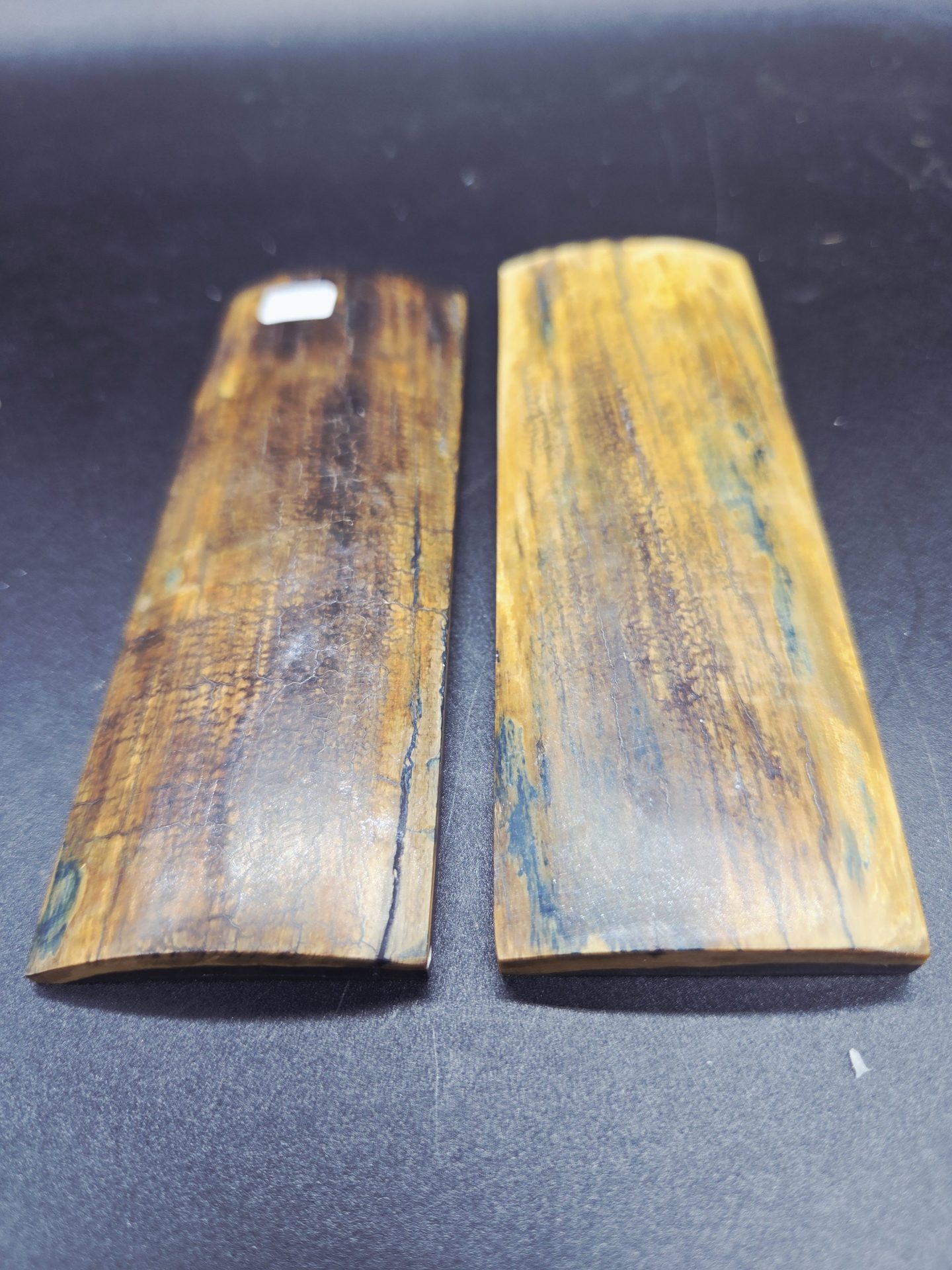 Paire d’écailles de mammouth stabilisées présentant un remarquable aspect bois avec grain prononcé. Parfaites pour les créations organiques et texturées. Matériau d’exception offrant une structure ligneuse saisissante, idéal pour les pièces nécessitant caractère et authenticité naturelle.