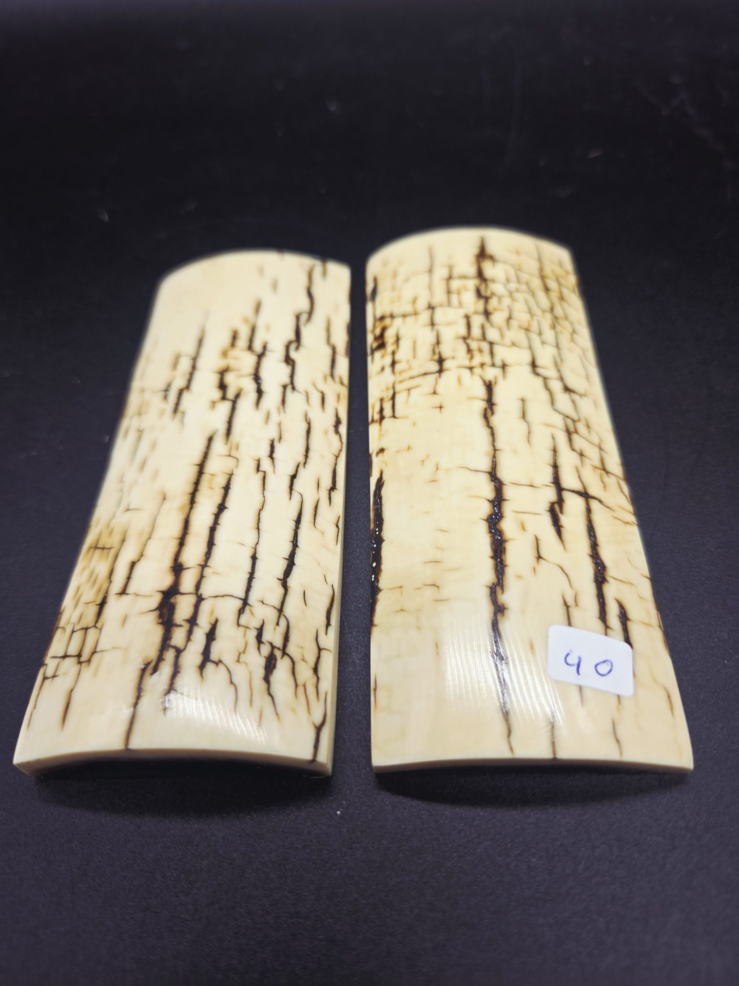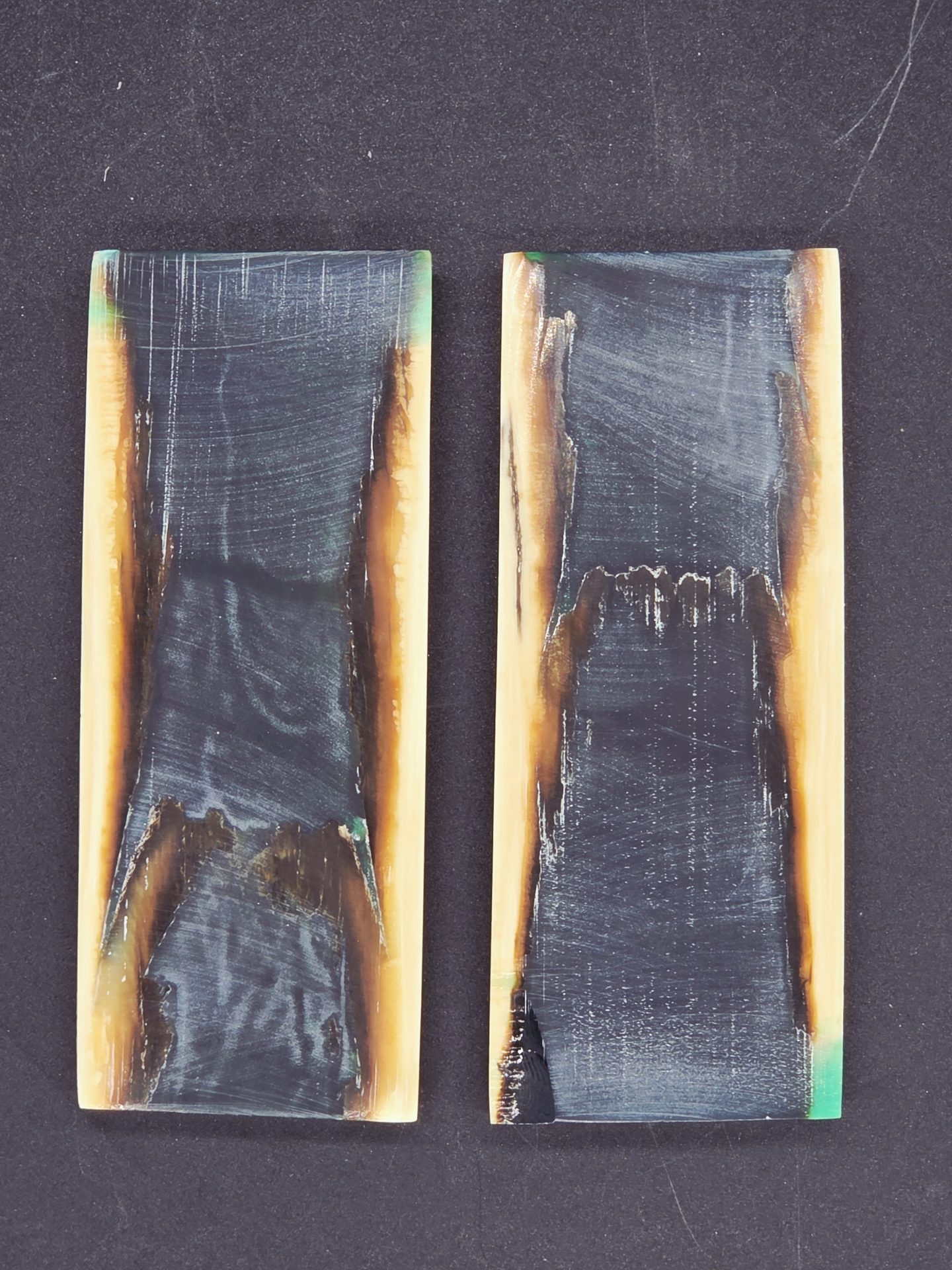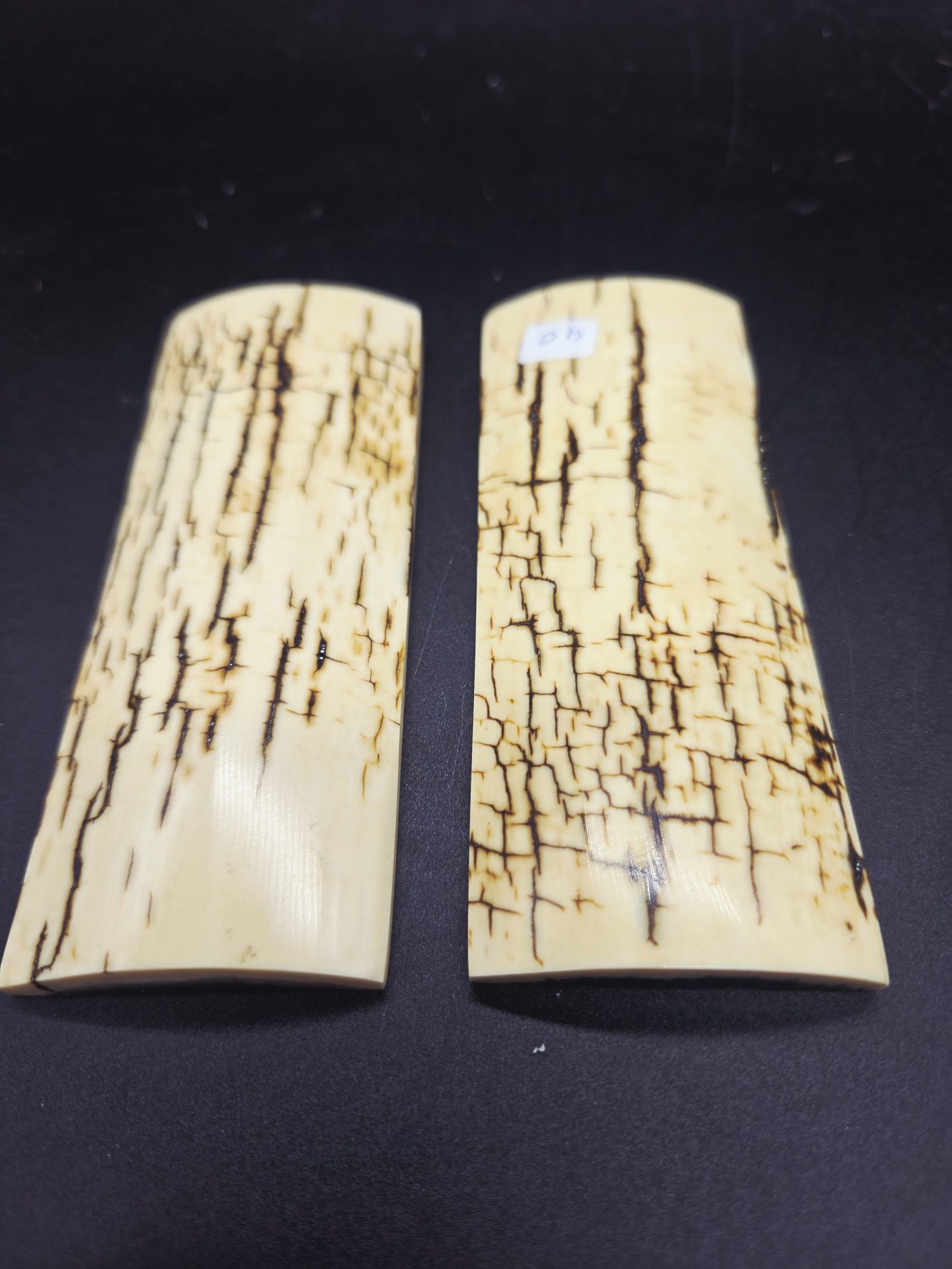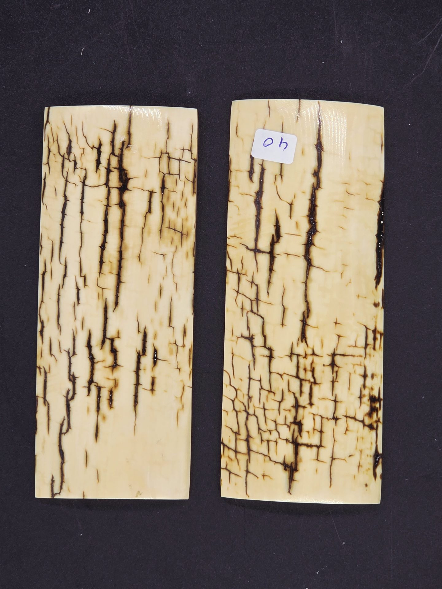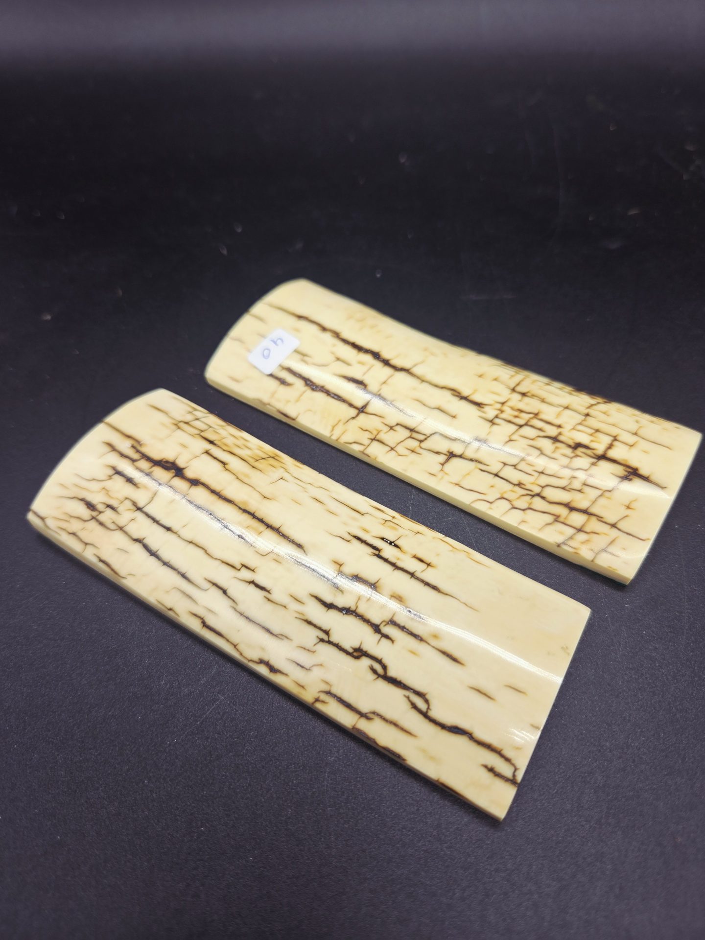 Paire d’écailles de mammouth stabilisées présentant un remarquable aspect bois avec grain prononcé. Parfaites pour les créations organiques et texturées. Matériau d’exception offrant une structure ligneuse saisissante, idéal pour les pièces nécessitant caractère et authenticité naturelle.