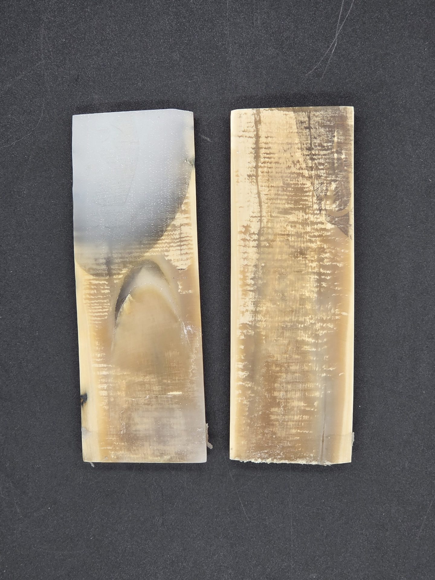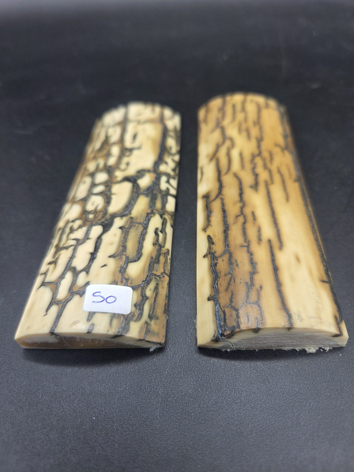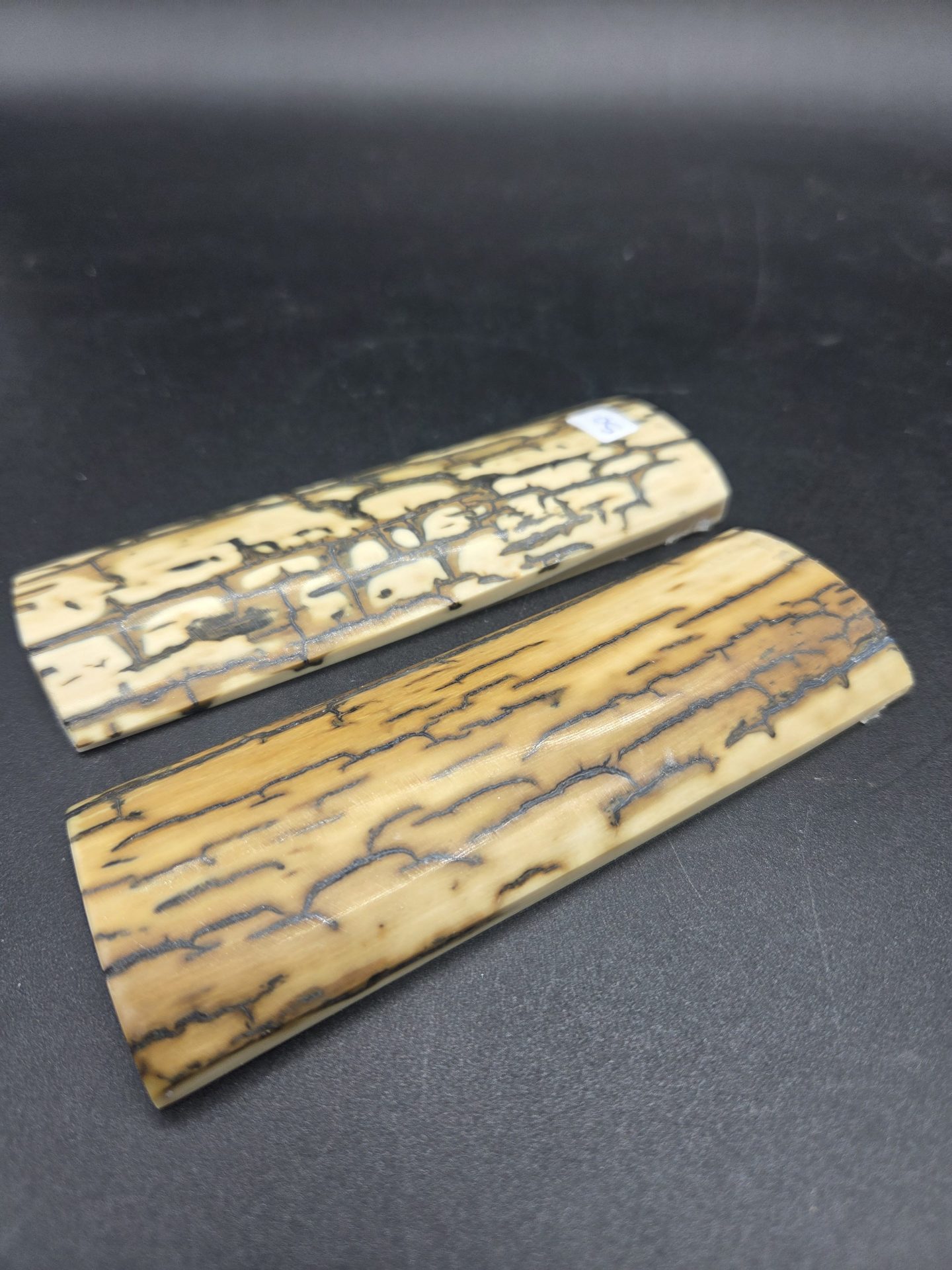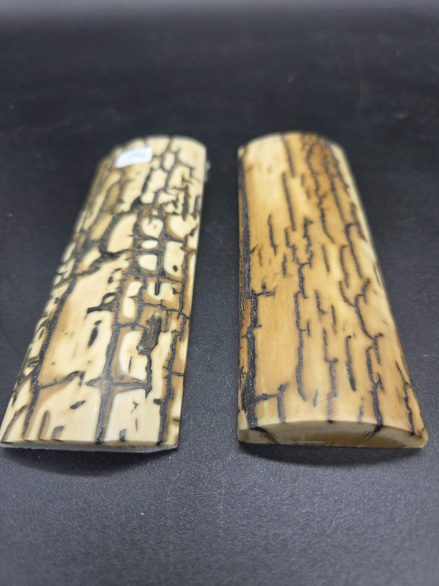 Paire d’écailles de mammouth stabilisées présentant un remarquable aspect bois avec grain prononcé. Parfaites pour les créations organiques et texturées. Matériau d’exception offrant une structure ligneuse saisissante, idéal pour les pièces nécessitant caractère et authenticité naturelle.