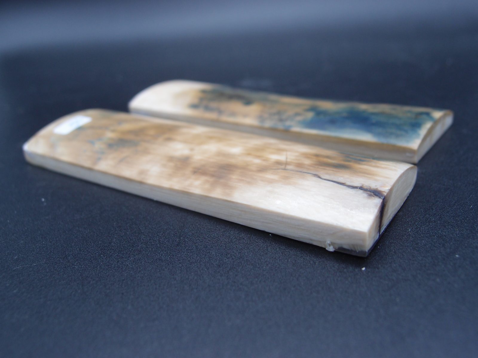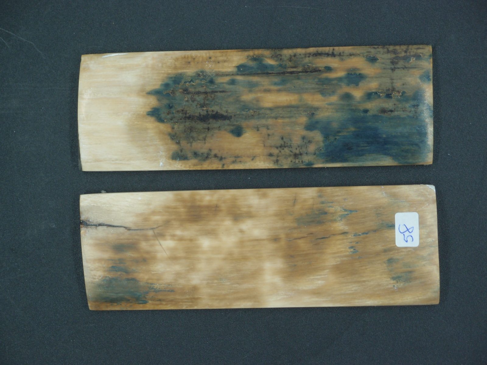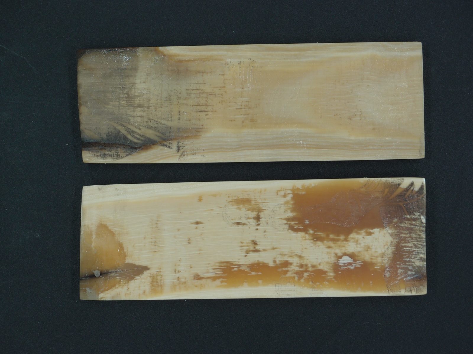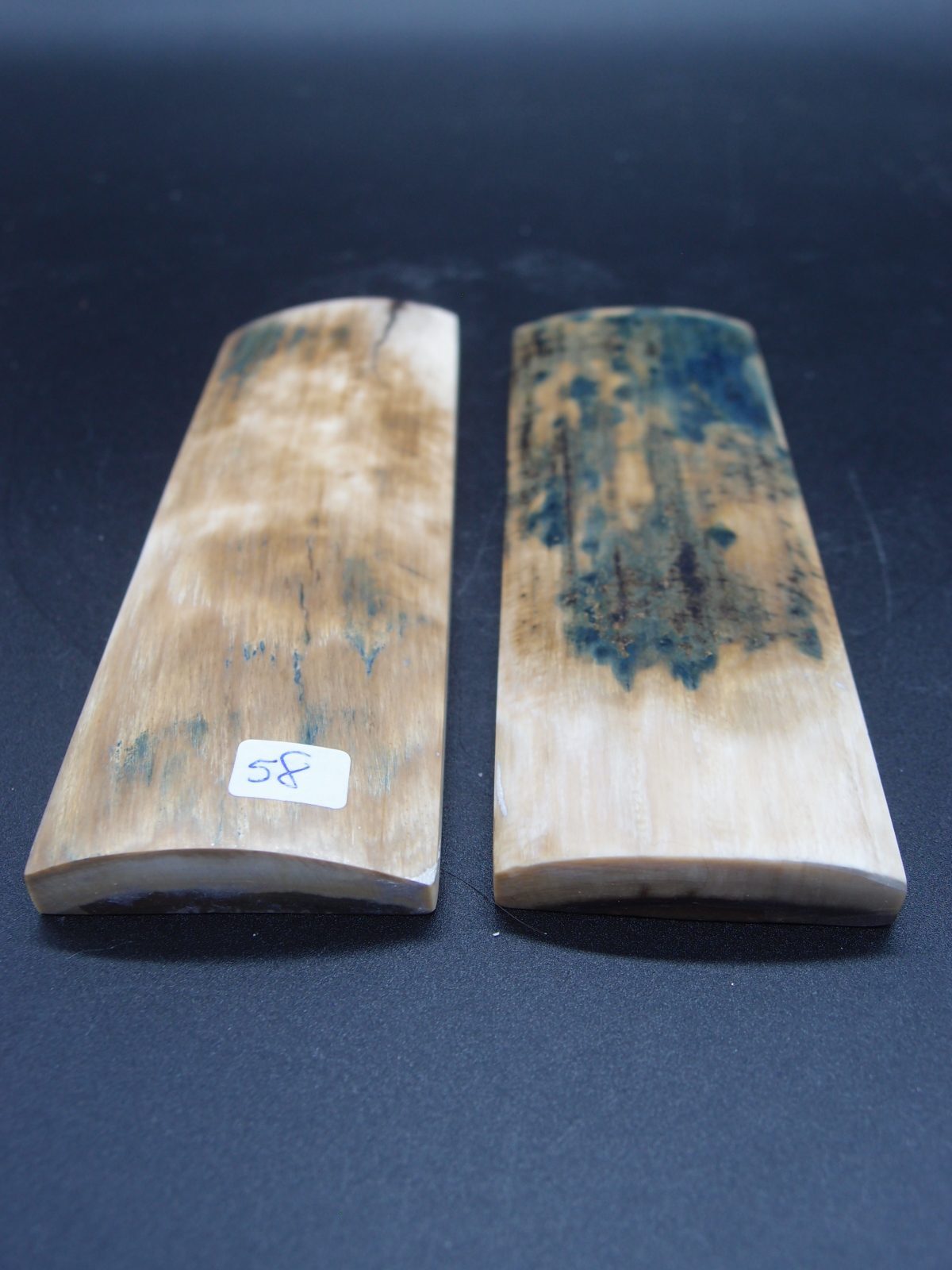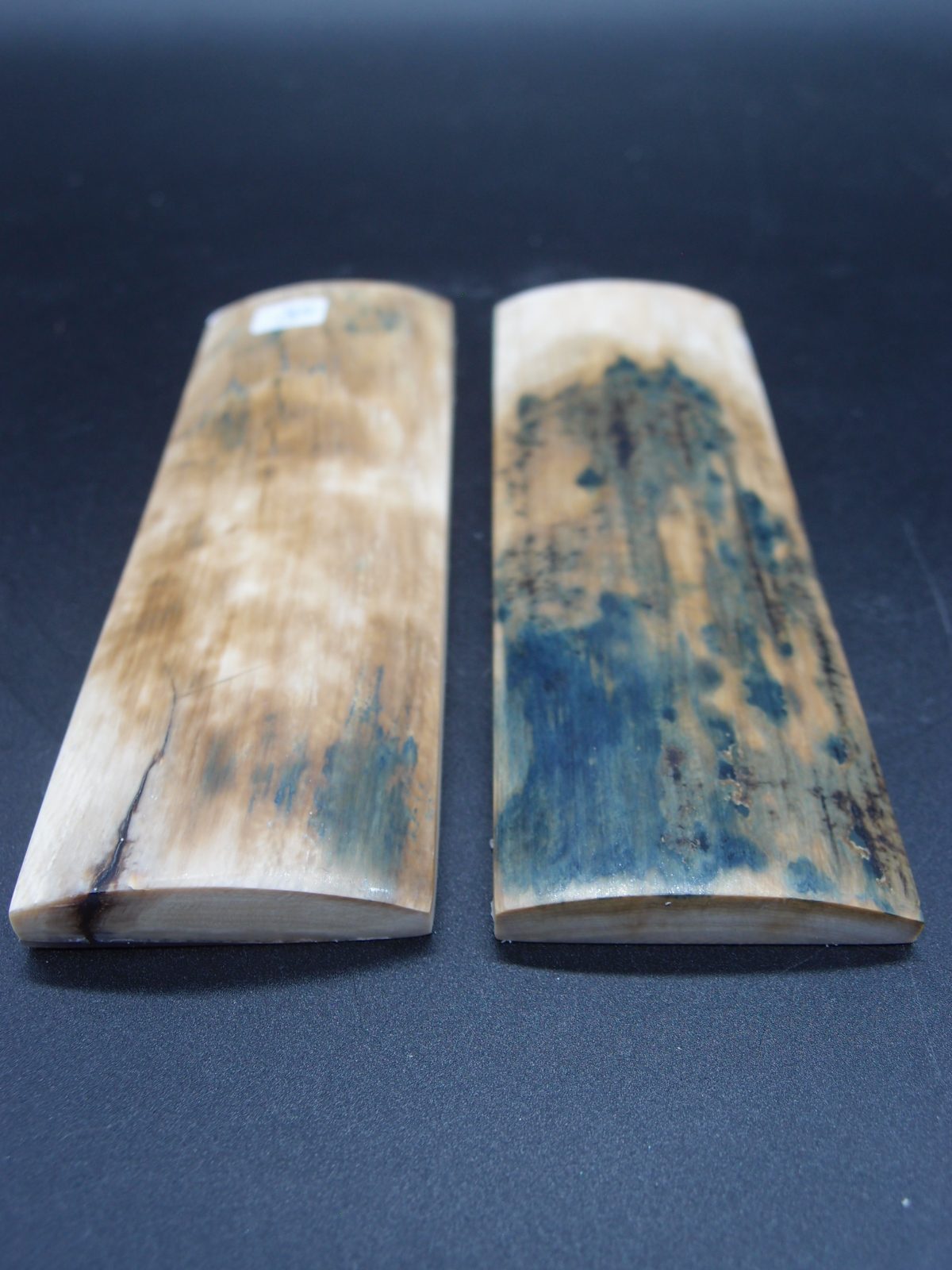 Paire d’écailles de mammouth stabilisées présentant un remarquable aspect bois avec grain prononcé. Parfaites pour les créations organiques et texturées. Matériau d’exception offrant une structure ligneuse saisissante, idéal pour les pièces nécessitant caractère et authenticité naturelle.
