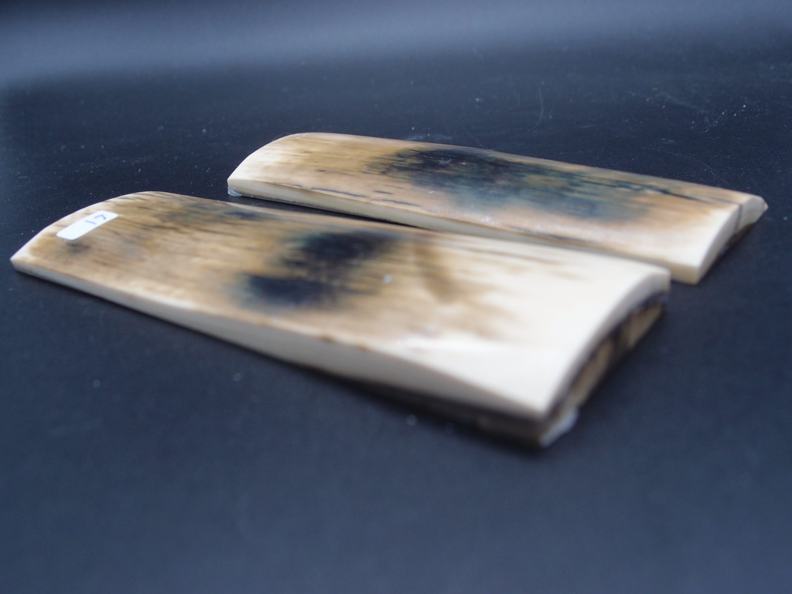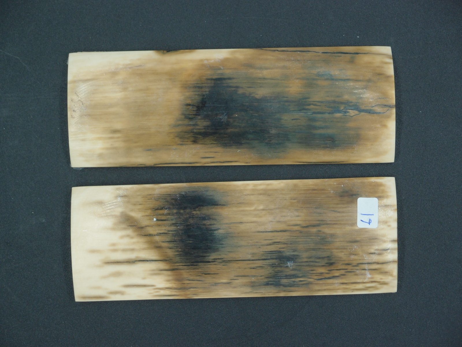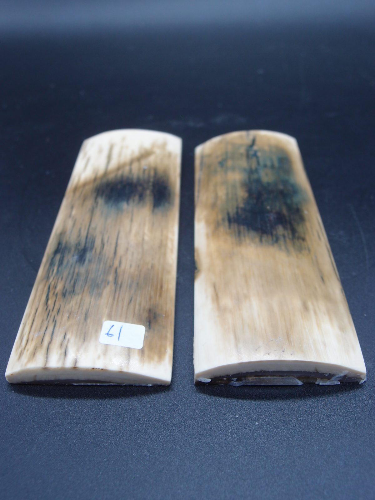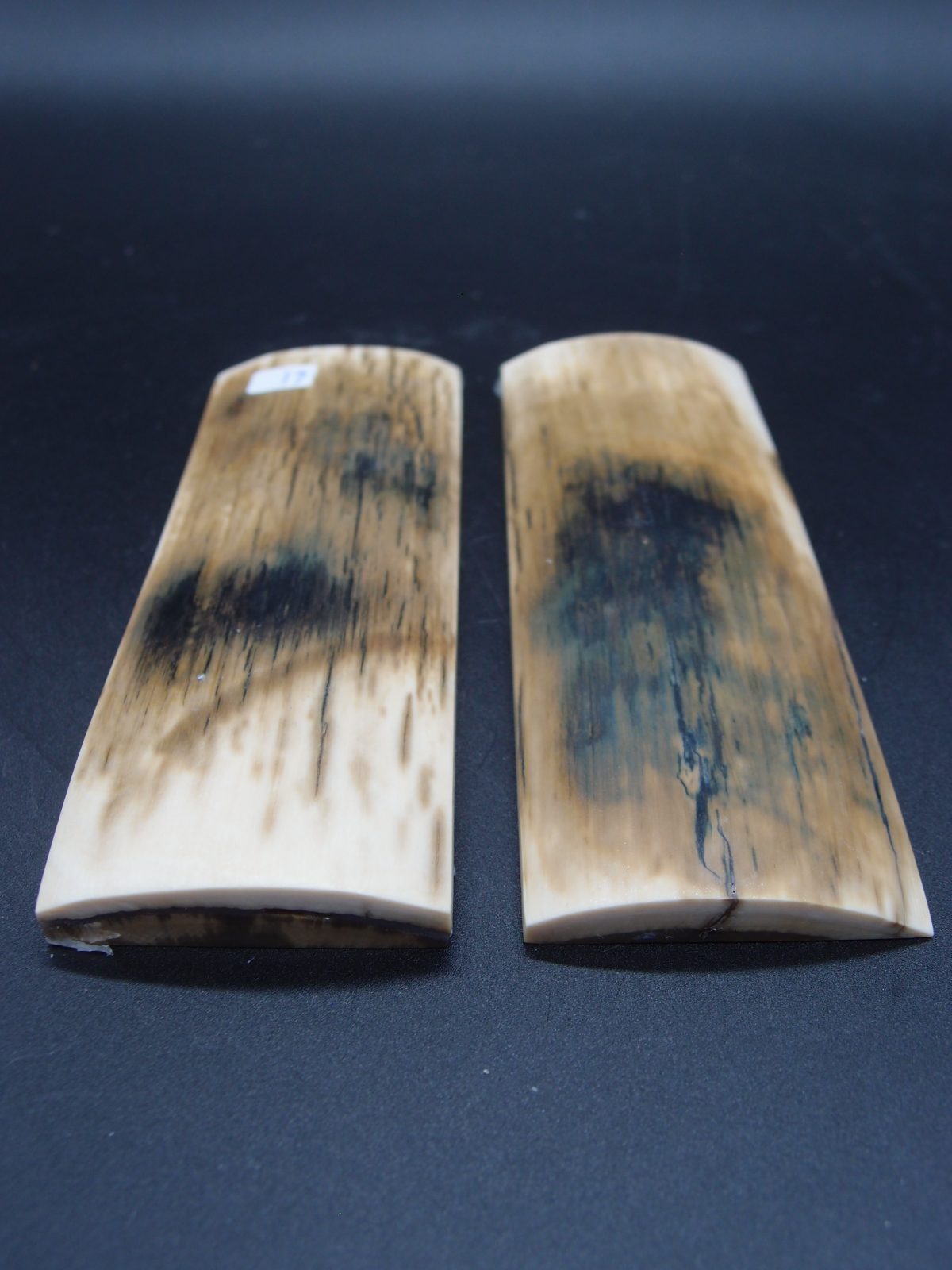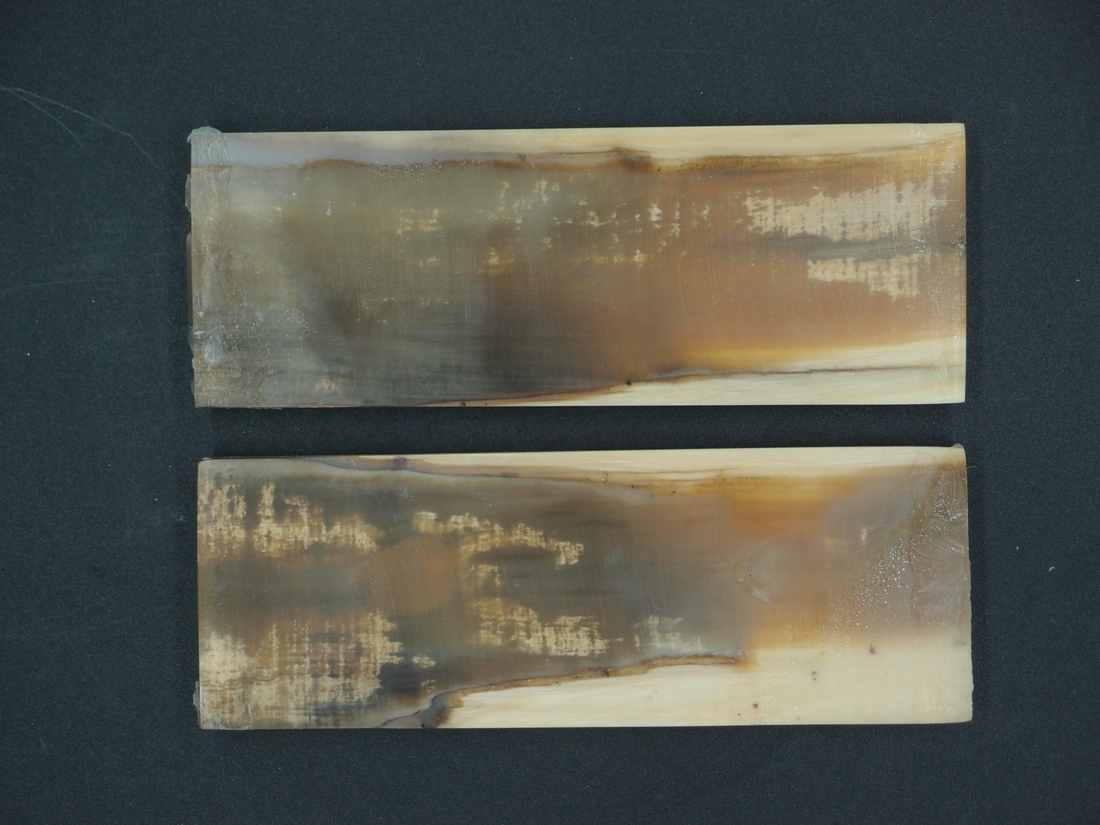 Paire d’écailles de mammouth stabilisées présentant un remarquable aspect bois avec grain prononcé. Parfaites pour les créations organiques et texturées. Matériau d’exception offrant une structure ligneuse saisissante, idéal pour les pièces nécessitant caractère et authenticité naturelle.