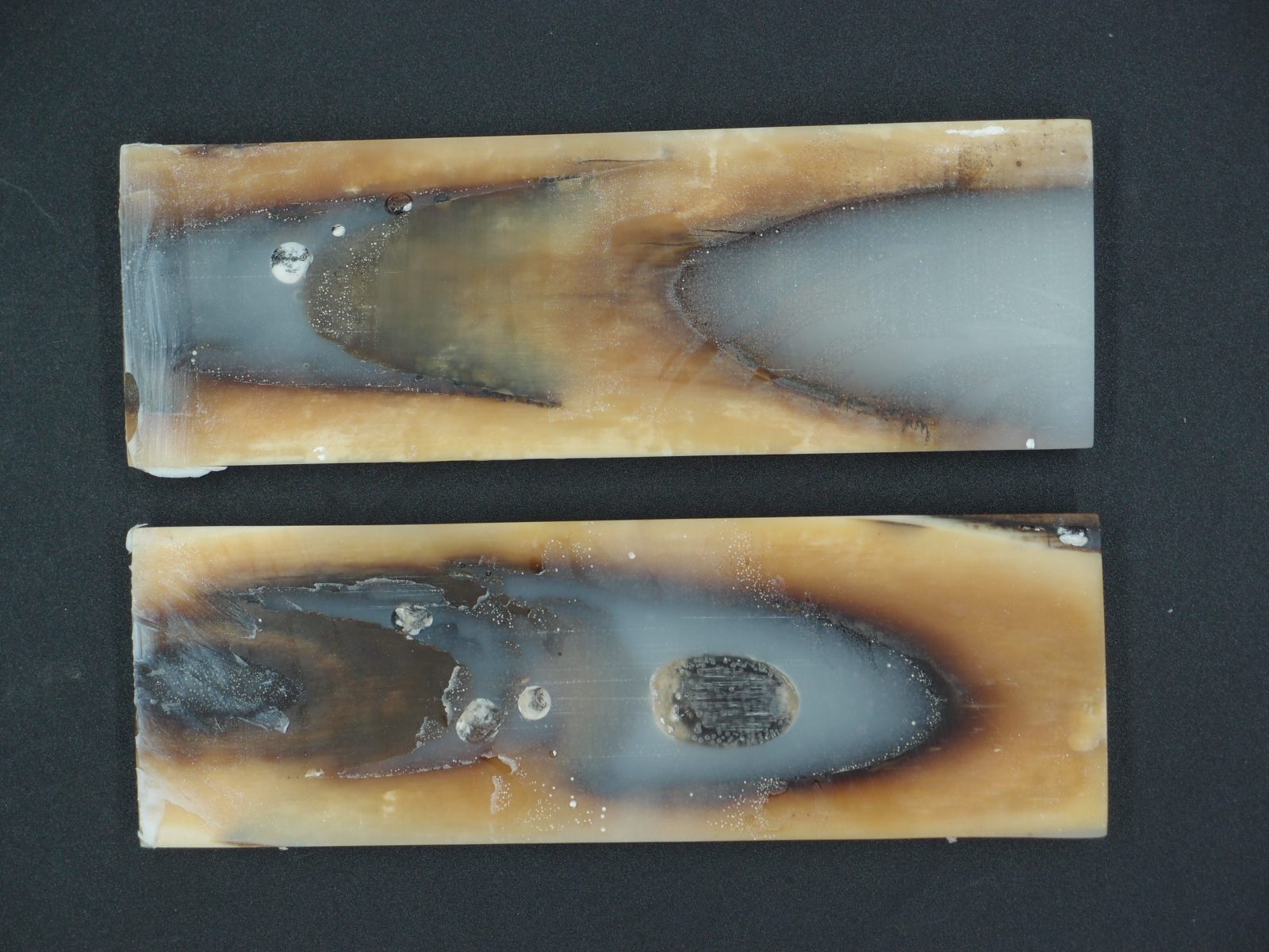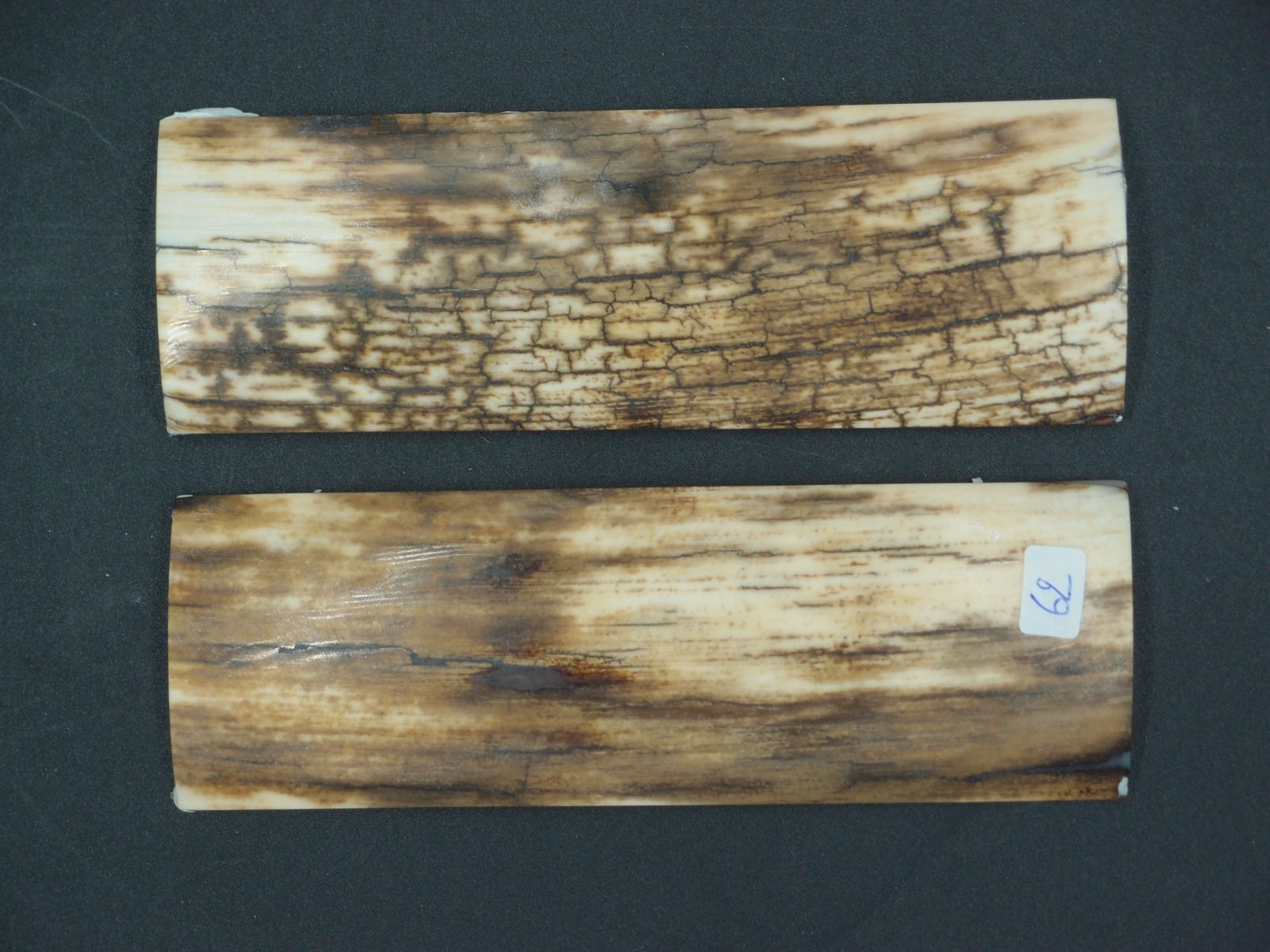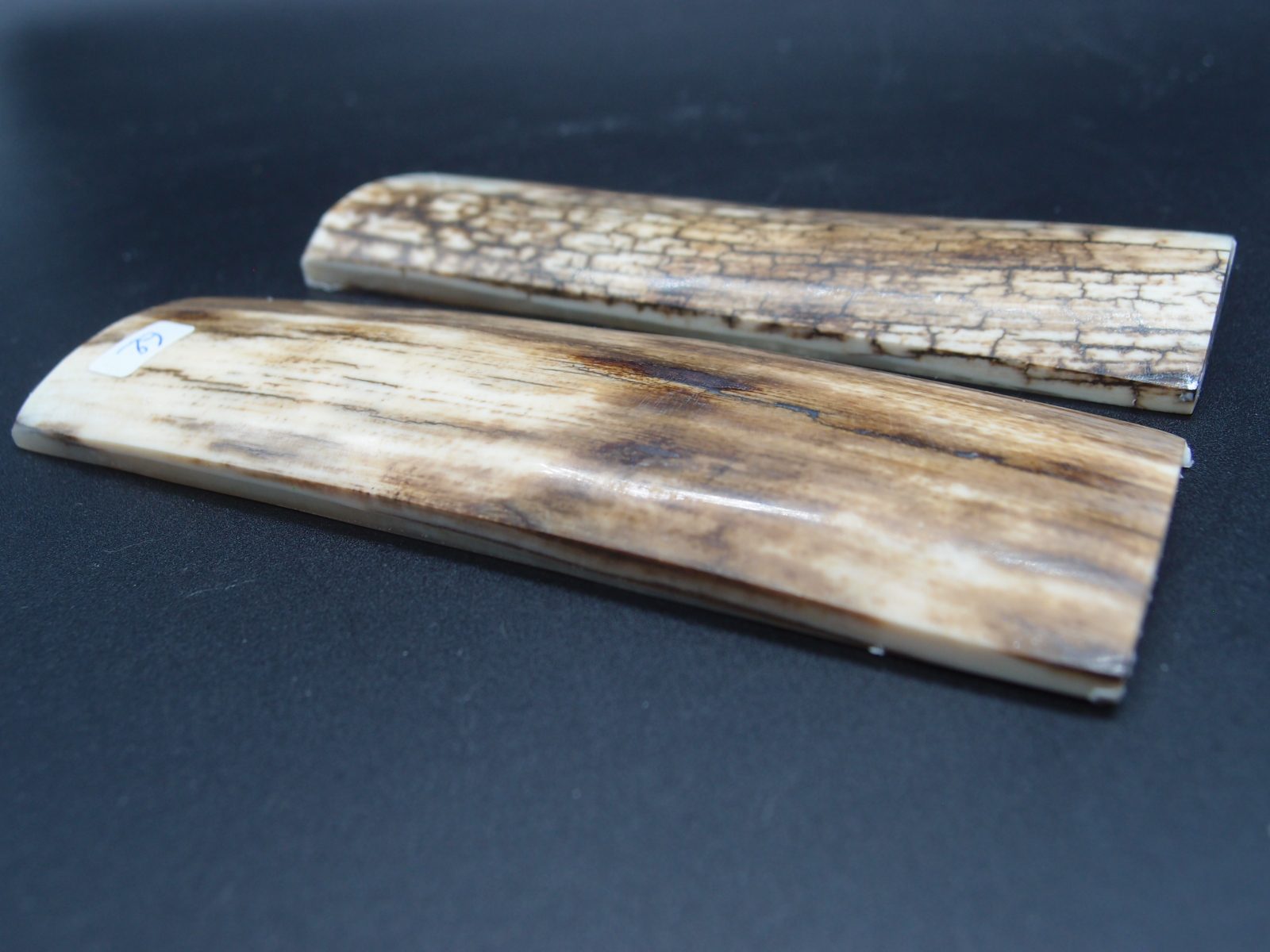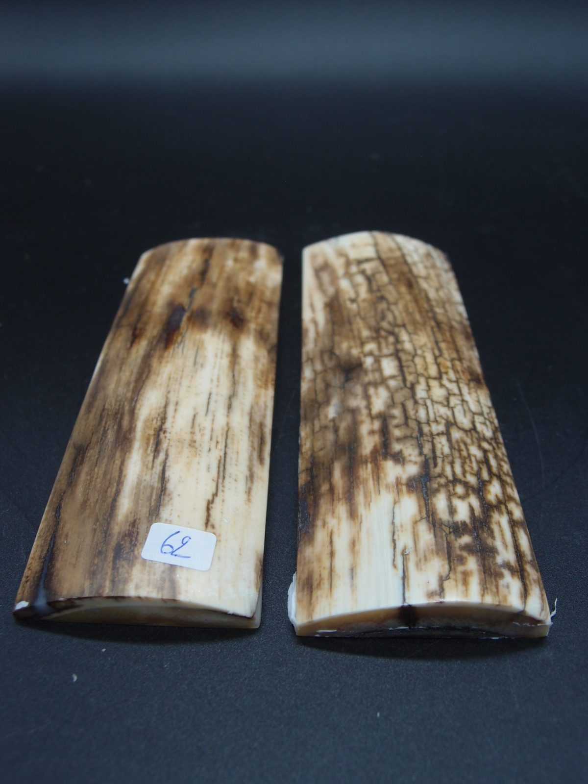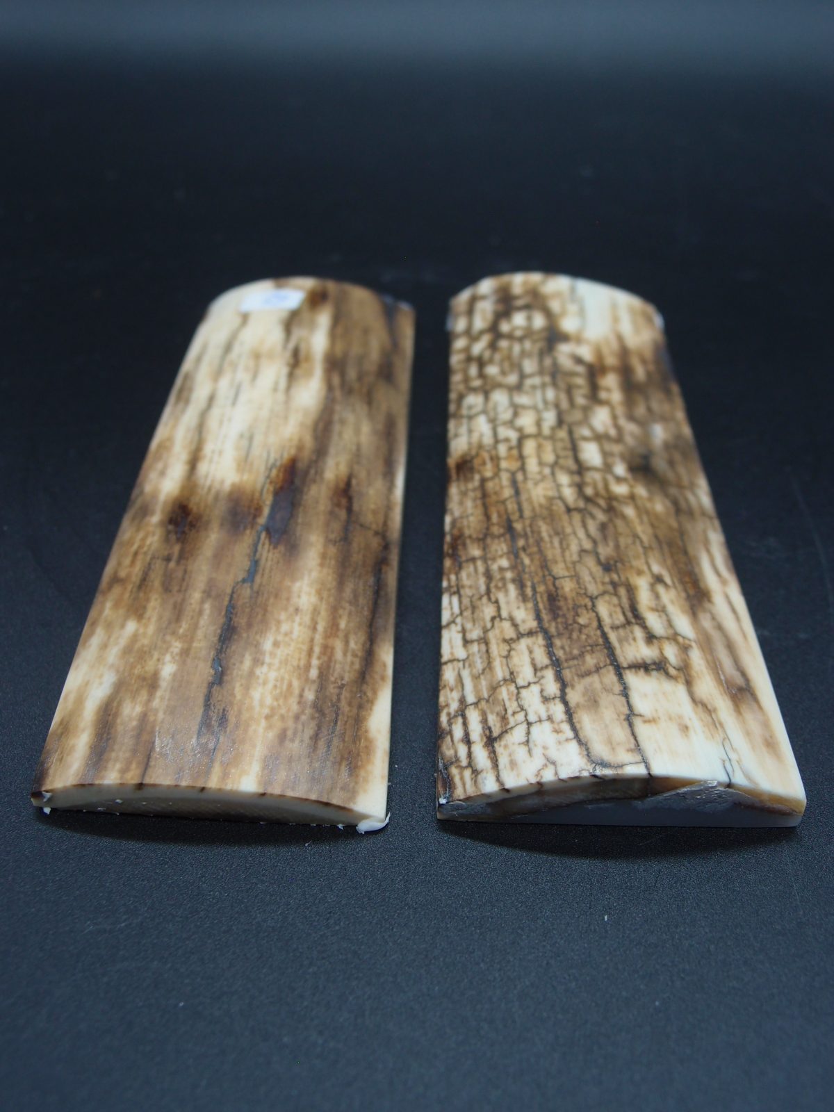 Paire d’écailles de mammouth stabilisées présentant un remarquable aspect bois avec grain prononcé. Parfaites pour les créations organiques et texturées. Matériau d’exception offrant une structure ligneuse saisissante, idéal pour les pièces nécessitant caractère et authenticité naturelle.